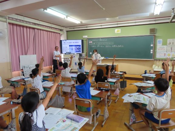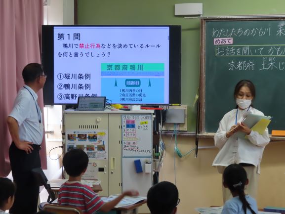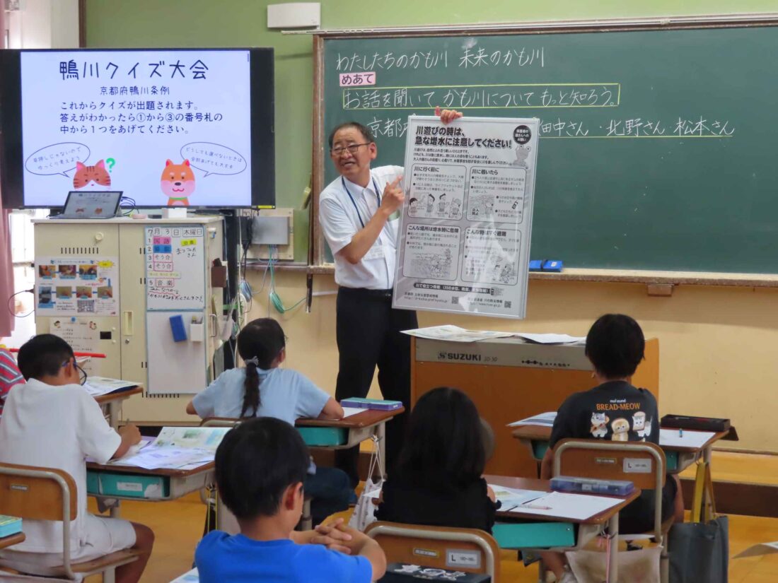 2025.7.3 京都府京都土木事務所が元町小学校で出前講座 2025.08.01 京都府京都土木事務所が令和7年7月3日、午前10時45分から午後12時20分まで元町小学校3年生14名の方に鴨川の魅力や鴨川を守るために取り組まれていることについて、出前講座を実施されました。 講義はクイズ形式で楽しく行われました。 これから川遊びが増えてくる時期を迎えるので、水難事故防止のため川に行くときの注意事項も説明されました ハーイ。全員正解です。皆さんありがとうございました。